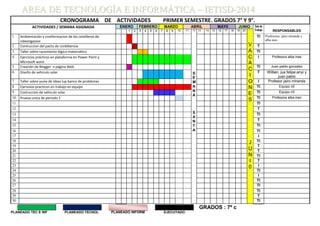 El cronograma de actividades para el primer semestre de los grados 7° y 9° incluye 30 actividades programadas para las semanas de enero a junio. Las actividades incluyen la conformación de grupos de investigación, la construcción de un pacto de convivencia, talleres sobre razonamiento lógico-matemático y lluvia de ideas, ejercicios prácticos en plataformas digitales y construcción de vehículos solares, con responsables asignados para cada actividad.