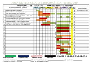 El cronograma de actividades para el primer semestre de los grados 7° y 9° incluye 30 actividades programadas de enero a junio. Las actividades se enfocan en el desarrollo del razonamiento lógico-matemático y abstracto a través de estrategias como la creación de equipos de trabajo, talleres, ejercicios prácticos en plataformas digitales y la realización de proyectos de investigación. Cada actividad está asignada a una semana específica y será responsabilidad de los profesores del área de tecnolog
