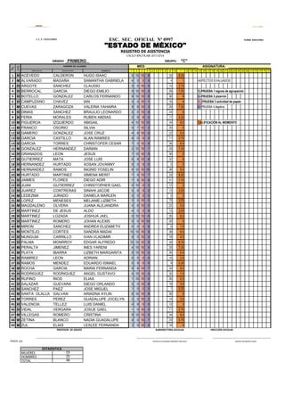 Este documento es un registro de asistencia de un grupo escolar en el ciclo 2013-2014 que incluye la lista de 48 estudiantes con sus nombres completos, género y calificaciones en 4 pruebas. El documento también incluye la firma del profesor, subdirectora y directora de la escuela.