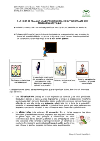 Este documento presenta información sobre las exposiciones orales, incluyendo las partes de una exposición oral (introducción, desarrollo y conclusión), consejos para su realización (preparación, contacto visual, tono de voz, etc.), y los tipos de lenguaje verbal y no verbal.