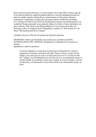 El documento habla sobre el origen y significado del Día del Trabajador. Explica que se conmemora el 1 de mayo en memoria de 5 obreros anarquistas que fueron fusilados en Chicago a finales del siglo 19 por pedir una jornada laboral de 8 horas. También menciona que la tradición de celebrar esta fecha se extendió a la Argentina a finales del siglo 19 e incrementó su importancia durante el gobierno de Perón, convirtiéndose en un día emblemático para los trabajadores.