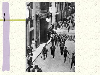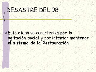 Este documento resume el período de 1898 a 1931 en España, que comenzó con el desastre del 98 y la proclamación de la Segunda República. Cubre temas como la generación del 98, el regeneracionismo, los problemas de España en el cambio de siglo como el atraso económico y la corrupción política, y las crisis políticas entre 1902 y 1912 que debilitaron el sistema de la Restauración.