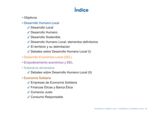 Este documento trata sobre el desarrollo humano local y el desarrollo económico local. Explica que el desarrollo humano local incorpora elementos del desarrollo humano, sostenible y local. También define conceptos como el desarrollo económico local, el empoderamiento económico y la soberanía alimentaria, e introduce la economía solidaria. El documento analiza cómo estas estrategias pueden contribuir al desarrollo humano local a través de iniciativas económicas territoriales.