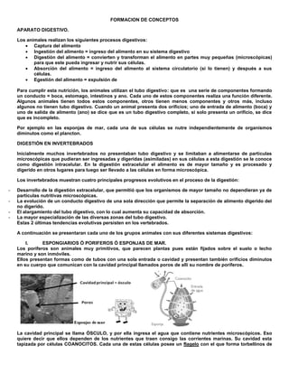 Este documento presenta información sobre el sistema digestivo en diferentes grupos animales. Explica que los animales capturan el alimento, lo ingieren, lo digieren, absorben los nutrientes y egestan los desechos a través de un tubo digestivo. Luego describe el sistema digestivo de varios filos, incluyendo poríferos, celentéreos, platelmintos, nematodos, anélidos, equinodermos, moluscos, artrópodos y vertebrados como peces, anfibios, reptiles, aves y mamíferos. En cada filo