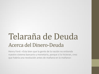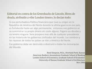Este documento resume la historia del sistema monetario estadounidense desde la época colonial hasta la Gran Depresión. Explica que hubo dos sistemas en competencia: uno operado desde Wall Street que favorecía un patrón oro controlado por bancos privados, y otro operado desde Filadelfia que favorecía un banco estatal que emitía dinero. Aunque Lincoln volvió al sistema de dinero emitido por el gobierno durante la Guerra Civil, los bancos recuperaron el control con la Ley de la Reserva Federal de 1913. Planes posteriores como