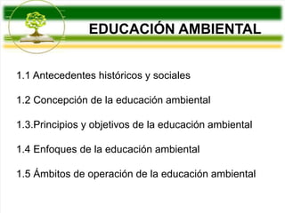 Este documento describe la educación ambiental, incluyendo sus antecedentes históricos, concepciones, principios, objetivos, enfoques y ámbitos de operación. Explica que la educación ambiental busca crear conciencia pública sobre el medio ambiente y problemas relacionados para trabajar en soluciones a través de conocimientos, actitudes, participación y acción. También cubre definiciones clave de educación ambiental según organizaciones internacionales y los principales hitos en su desarrollo.