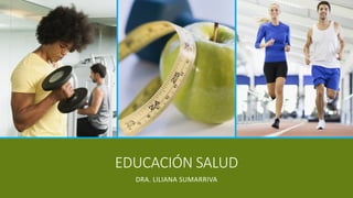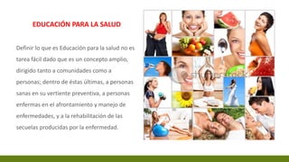 El documento habla sobre la educación para la salud. Define la educación para la salud y explica que promueve el bienestar físico, mental y social de las personas sanas a través de la prevención y de las personas enfermas a través del manejo y rehabilitación de enfermedades. También describe diferentes modelos de intervención como el biomédico, preventivo y comunitario, y principios pedagógicos como la flexibilidad y cooperación. Finalmente, cubre temas como la atención primaria de salud, la organización del sector salud y estrateg