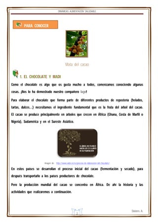El documento presenta una actividad educativa sobre la producción del chocolate y las condiciones de vida de los niños en África donde se cultiva el cacao. La actividad involucra a los estudiantes ordenando cartas que cuentan la historia de Madi, un niño de Ghana que vive en una familia de agricultores de cacao. Los estudiantes también discuten cómo el comercio justo y comprar chocolate de comercio justo puede ayudar a mejorar las vidas de los niños en África.