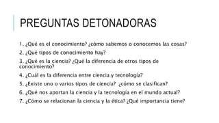 El documento explora el concepto de conocimiento y su clasificación en tipos como el sentido común, conocimiento religioso, empírico, filosófico y científico, destacando las diferencias entre ciencia y tecnología. Se aborda la importancia de la ética en la práctica científica, analizando casos históricos como Tuskegee y Willowbrook, que evidencian abusos en investigaciones. Asimismo, se presentan normas del Código de Núremberg sobre la ética en experimentación humana.