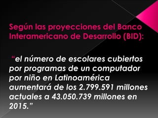 Según el BID, el número de estudiantes cubiertos por programas de un computador por niño en América Latina aumentará de aproximadamente 2.8 millones actualmente a 43 millones en 2015. El documento describe varios programas de distribución de computadoras portátiles a estudiantes y maestros en Argentina, Uruguay y Chile con el objetivo de mejorar la calidad de la educación a través de la integración de la tecnología en el aula.