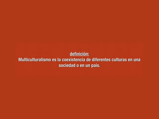 El documento discute el concepto de multiculturalismo y cómo en la práctica a menudo se da prioridad al arte y la cultura occidental sobre otras, adoptando una perspectiva colonialista. Sin embargo, un enfoque descolonizador evita etiquetas como "primitivo" y en su lugar resalta el trabajo de las periferias de manera horizontal y no jerárquica.