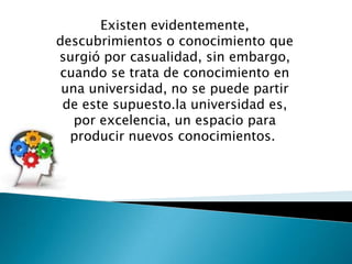 El documento describe el conocimiento científico como un proceso sistemático de recolectar, organizar, analizar e interpretar información. Aunque algunos descubrimientos ocurren por casualidad, la universidad se enfoca en producir nuevo conocimiento de manera intencional. El conocimiento implica entender la realidad y permite que los humanos actúen de manera consciente y establezcan una relación con el mundo. El mundo hace posible el conocimiento al ofrecerse a sujetos capaces de comprenderlo. El conocimiento puede transformar al sujeto y al objeto al permit