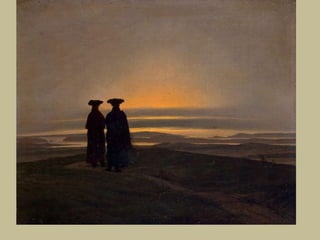 El documento resume las características del Romanticismo como movimiento artístico surgido a finales del siglo XVIII en reacción al racionalismo de la Ilustración. En pintura, destaca la obra de Caspar David Friedrich en Alemania, William Turner en Inglaterra, y Delacroix y Géricault en Francia, conocidos por sus paisajes y escenas históricas que exaltan la naturaleza y las emociones. El Romanticismo influyó notablemente en la literatura, música y otras artes durante el siglo XIX.