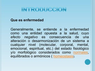 Este documento resume las principales enfermedades que afectan a los diferentes sistemas del cuerpo humano. Explica que las enfermedades pueden clasificarse como agudas o crónicas, dependiendo de su duración, y como infecciosas o no infecciosas, dependiendo de su causa. También destaca la importancia de una alimentación saludable para prevenir enfermedades y apoyar la recuperación.