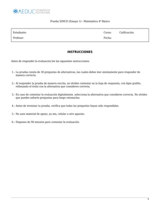 Este documento presenta las instrucciones para una prueba SIMCE de matemática para 4o básico. Consta de 30 preguntas de alternativas múltiples con respuestas numéricas. Los estudiantes disponen de 90 minutos para completar la prueba y no pueden usar material de apoyo como celulares.