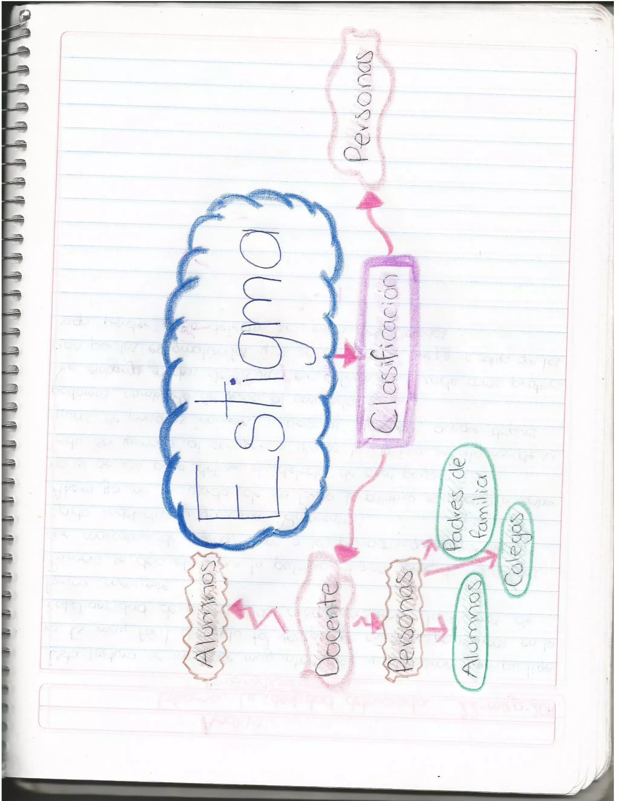El documento resume la reflexión de una persona sobre el concepto de "estigma" y su clasificación de personas. Aprendió que el estigma ya no implica necesariamente marcas físicas, sino más bien prejuicios. Utilizó un diagrama de telaraña para organizar sus ideas. La lectura también destaca que siempre clasificamos a los demás y que los prejuicios iniciales no siempre son correctos. Otro punto importante es que las personas estigmatizadas a veces se victimizan y usan su defecto para evadir responsabilidades, aunque luego extrañan esa prote