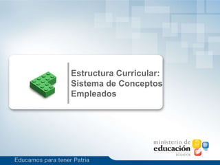 El documento describe los componentes clave de una estructura curricular, incluyendo el perfil de salida, los objetivos educativos de las áreas y del año, las destrezas con criterios de desempeño, las precisiones de la enseñanza y aprendizaje, e indicadores esenciales de evaluación. Explica la relación entre estos componentes y cómo los objetivos educativos y las destrezas se traducen en indicadores concretos que demuestran los resultados del aprendizaje.