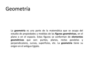 Este documento trata sobre la geometría y sus elementos básicos. Explica que la geometría estudia las propiedades y medidas de las figuras geométricas en el plano y el espacio, las cuales se componen de elementos como puntos, líneas, curvas y superficies. Luego describe algunos de estos elementos geométricos fundamentales como la circunferencia, la mediatriz, la bisectriz y las líneas paralelas, y presenta métodos para trazar estas figuras.