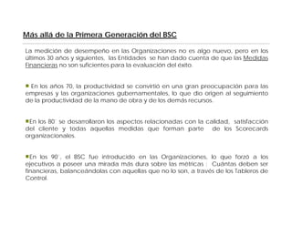 El documento describe la evolución del Balanced Scorecard (BSC) a lo largo de tres etapas. La primera etapa se centró en indicadores financieros y operacionales. La segunda etapa agregó métricas de calidad. La tercera etapa incluyó indicadores para todos los grupos de interés. El documento también analiza problemas comunes en los scorecards actuales y las mejores prácticas identificadas por APQC.