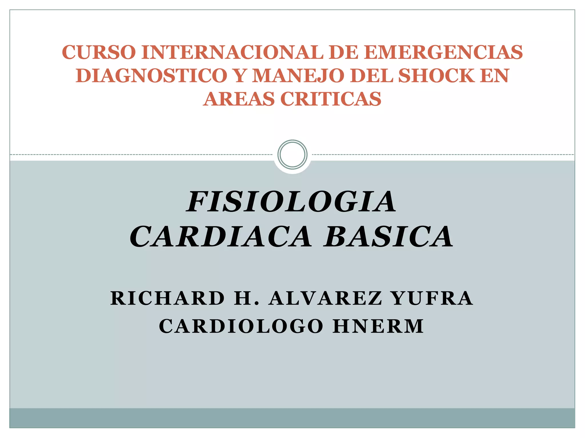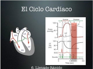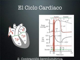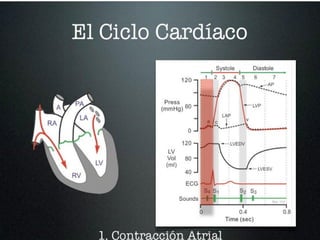 Este documento describe la fisiología cardíaca básica. Explica que el corazón está dividido en 4 cavidades - dos aurículas y dos ventrículos - y bombea la sangre a través del cuerpo. El ciclo cardíaco consta de las fases de sístole y diástole. El gasto cardíaco depende de la frecuencia cardíaca y el volumen de eyección por latido, mientras que la presión arterial depende del gasto cardíaco y la resistencia vascular periférica.