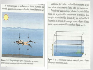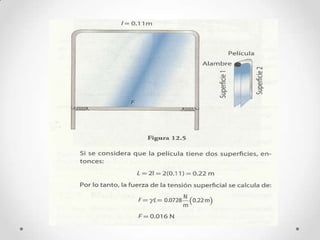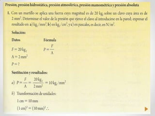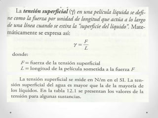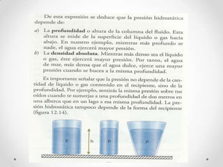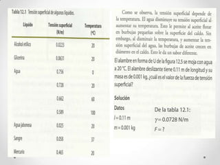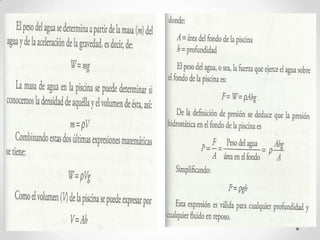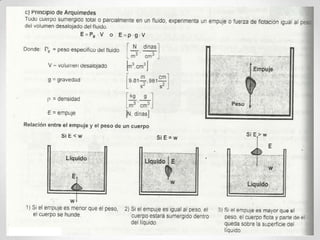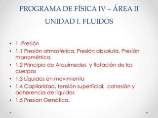Este documento presenta información sobre fluidos. Explica conceptos clave como presión, tensión superficial, capilaridad, viscosidad y densidad. También describe diferentes tipos de fluidos como líquidos y gases, e introduce los principios básicos de la hidrostática y la hidrodinámica. El objetivo es que los estudiantes comprendan los principios físicos fundamentales que rigen el comportamiento y movimiento de los fluidos.
