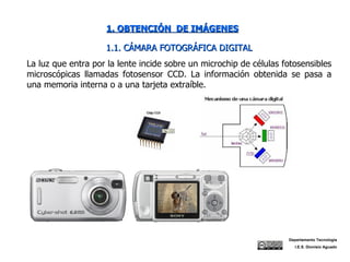 El documento describe los conceptos básicos de las imágenes digitales, incluyendo la obtención de imágenes a través de cámaras digitales, escáneres y otros dispositivos, los formatos de almacenamiento de imágenes, y las características clave de una imagen digital como la profundidad de color, resolución, compresión y tamaño. También explica los diferentes tipos de imágenes como mapas de bits, vectoriales y 3D, y los usos comunes de las imágenes en pantallas e impresión.