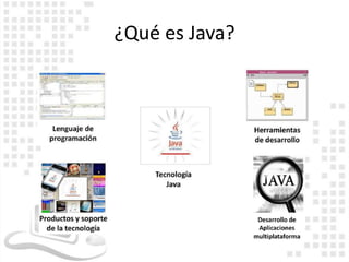 Este documento describe los fundamentos del lenguaje de programación Java. Explica que Java es un lenguaje orientado a objetos, distribuido, simple, multihilos y seguro que es independiente de la plataforma. También describe las características clave del lenguaje como la orientación a objetos, la distribución, la simplicidad, los hilos múltiples y la seguridad. Además, explica brevemente qué es la máquina virtual de Java y los elementos básicos de una clase en Java como atributos y métodos.