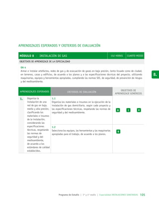 Este documento describe los aprendizajes esperados para el módulo de instalación de gas. Se espera que los estudiantes aprendan a planificar y ejecutar la construcción de redes de gas en baja presión, verificar su funcionamiento e instalar artefactos de gas clase A y B. Al finalizar el módulo, deberán ser capaces de organizar los materiales e insumos para la instalación de gas doméstico y reconocer términos técnicos.