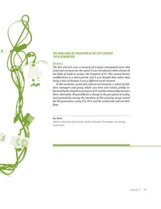 El documento discute la "generación N", una generación que creció con la omnipresencia de las tecnologías de la información y la comunicación como las computadoras e Internet. Se caracterizan por ser tecnófilos, visuales, inmediatos y preferir aprender de manera no tradicional usando nuevas tecnologías. Su contexto social y cultural ha sido moldeado por factores como la globalización y la diversidad, lo que los hace muy diferentes a generaciones anteriores.