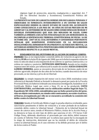 Este documento presenta una acción de hábeas corpus interpuesta por el abogado Efrain Bruno Salinas Llactas a nombre de Miguel Angel Silva Tapia, quien se encuentra encarcelado en el Penal de Reos Primarios San Jorge. La acción se presenta contra funcionarios públicos por la omisión en la atención de la salud de Silva Tapia, quien ha perdido la visión y su salud se ha deteriorado luego de más de 8 años de encarcelamiento. El documento detalla los fundamentos de la acción, incluyendo la historia del caso penal