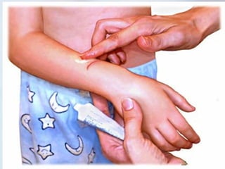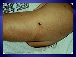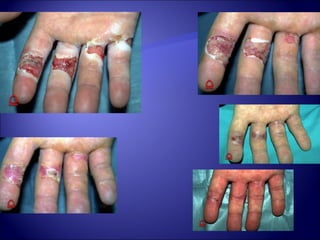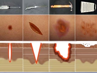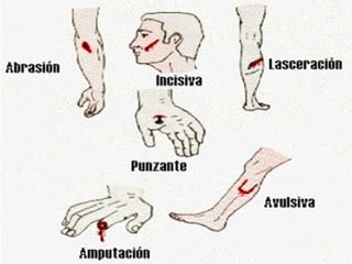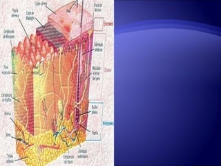 El documento describe las características y funciones de la epidermis y dermis de la piel humana. La epidermis se regenera cada 2-3 semanas y protege contra daños ambientales, mientras que la dermis proporciona durabilidad, flexibilidad y un andamio para la migración celular. El documento también clasifica los tipos de heridas cutáneas y resume las fases de cicatrización, incluida la inflamación, proliferación y maduración.