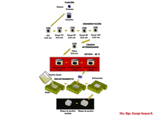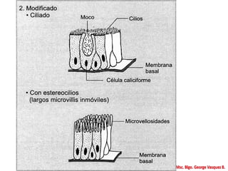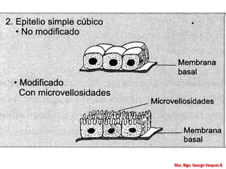 Este documento presenta una introducción a la histología y las técnicas histológicas básicas. Explica que la histología estudia los tejidos a nivel microscópico, incluyendo las células, órganos y sistemas. Describe los componentes de los tejidos, los pasos para preparar muestras para el microscopio, diferentes técnicas como tinción e inmunocitoquímica, y diferentes tipos de microscopía como electrónica. Finalmente, presenta diferentes tipos de epitelios y sus caracter