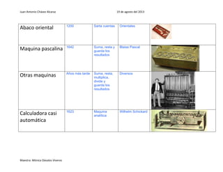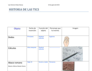El documento describe la historia del desarrollo de varios objetos importantes para el cálculo y procesamiento de información, incluyendo el ábaco inventado por los egipcios, la máquina analítica de Wilhelm Schickard en 1623, la primera computadora programada de J. Von Neumann en 1946, el transistor desarrollado en 1947, el microprocesador en 1977, y el USB y Internet que revolucionaron el almacenamiento y comunicación de datos.