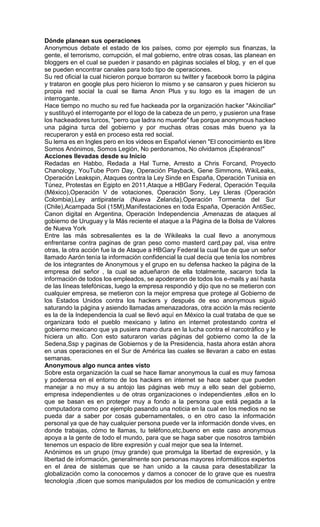 Anonymous es un grupo de hackers descentralizado que promueve la libertad de expresión y la transparencia. Sus miembros se organizan en línea de forma anónima para llevar a cabo ataques cibernéticos como protesta contra gobiernos, corporaciones u organizaciones que consideran opresivas. Algunas de sus acciones más destacadas incluyen apoyar a Wikileaks, atacar empresas de tarjetas de crédito que bloquearon donaciones, y realizar campañas de desobediencia civil digital en países con gobiernos autoritarios.