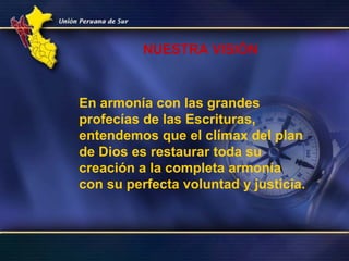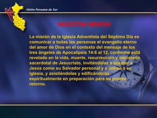 La visión de la Iglesia Adventista del Séptimo Día es restaurar toda la creación a la armonía con la voluntad y justicia de Dios. Su misión es comunicar el evangelio eterno de amor de Dios a todas las personas a través del mensaje de los tres ángeles de Apocalipsis 14, invitándolas a aceptar a Jesús como Salvador y unirse a su iglesia. Su método incluye el ministerio de predicación, enseñanza y sanidad para anunciar el mensaje de Dios, desarrollar la comprensión de