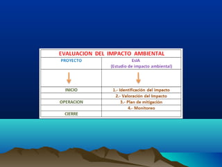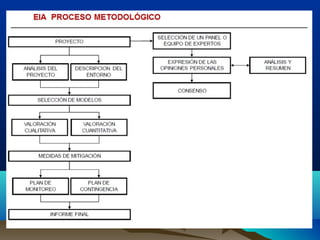 El documento describe los métodos para la identificación y evaluación de impactos ambientales como parte de un Estudio de Impacto Ambiental. Explica que la identificación de impactos es el punto de partida para el diseño de instrumentos de protección ambiental que se plasmarán en un Plan de Manejo Ambiental. Luego enumera y describe brevemente varios métodos comunes para la evaluación de impactos como reuniones de expertos, listas de verificación, matrices causa-efecto y cartografía ambiental. Finalmente, presenta una tipología para clasificar diferentes tipos