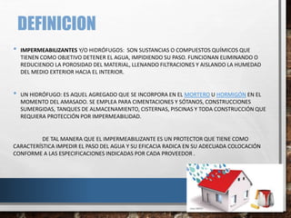 Este documento define e describe los impermeabilizantes y sus usos. Explica que los impermeabilizantes evitan el paso del agua al sellar la porosidad de los materiales. Luego describe los principales tipos de impermeabilizantes como acrílicos, asfálticos y cementosos, y sus materiales componentes. Finalmente discute las clasificaciones y usos comunes de los diferentes tipos de impermeabilizantes.