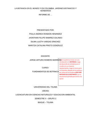 Este documento resume la historia de la botánica en el mundo y en Colombia, incluyendo los principales contribuidores a lo largo de la historia como Teofrasto, Linneo, Darwin y otros. También describe los jardines botánicos y herbarios como métodos clave de la botánica, resaltando los principales representantes de la botánica en el mundo y en Colombia a través de los tiempos.