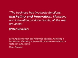El documento habla sobre la jornada "Marketing e Innovación". Explica que la innovación y el marketing son las dos funciones básicas de las empresas según Peter Drucker, porque producen resultados mientras que el resto son costos. Luego detalla los diferentes temas que se abordarán en la jornada como innovación como estrategia organizacional, marketing innovador, técnicas innovadoras en marketing y casos de éxito con marketing innovador y realidad aumentada.