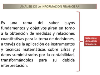 Este documento presenta una introducción al análisis de la información financiera. Explica que el análisis financiero transforma los datos contables en medidas cuantitativas para la toma de decisiones. Identifica a los principales usuarios de la información financiera como otorgantes de crédito, inversionistas y directivos. También describe los objetivos del análisis financiero como medir la rentabilidad y situación financiera de una empresa para evaluar su desempeño y predecir su evolución. Finalmente, resume los principales estados financieros como el balance general,