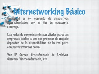 Este documento resume los conceptos básicos de las redes de comunicaciones. Explica que una red permite compartir recursos como voz IP, correo electrónico y videoconferencia entre dispositivos interconectados. Describe los componentes clave de una red como PCs, servidores, switches y routers. Además, explica los modelos OSI e Internet que definen los protocolos de comunicación entre capas. Finalmente, detalla cada una de las 7 capas del modelo OSI, incluyendo sus funciones, protocolos y estándares asociados para la transmisión de datos a través de