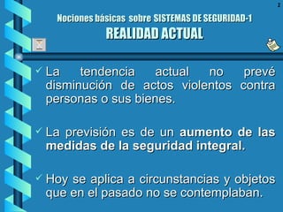 El documento habla sobre los sistemas de seguridad anti-intrusión, explicando que actualmente hay un aumento en las medidas de seguridad debido al aumento de actos violentos. Describe los diferentes tipos de riesgos como los naturales, tecnológicos o sociales/antisociales y las personas y bienes que pueden ser afectados. También analiza los agentes causantes de riesgos como los laborales, técnicos o derivados de actos antisociales.