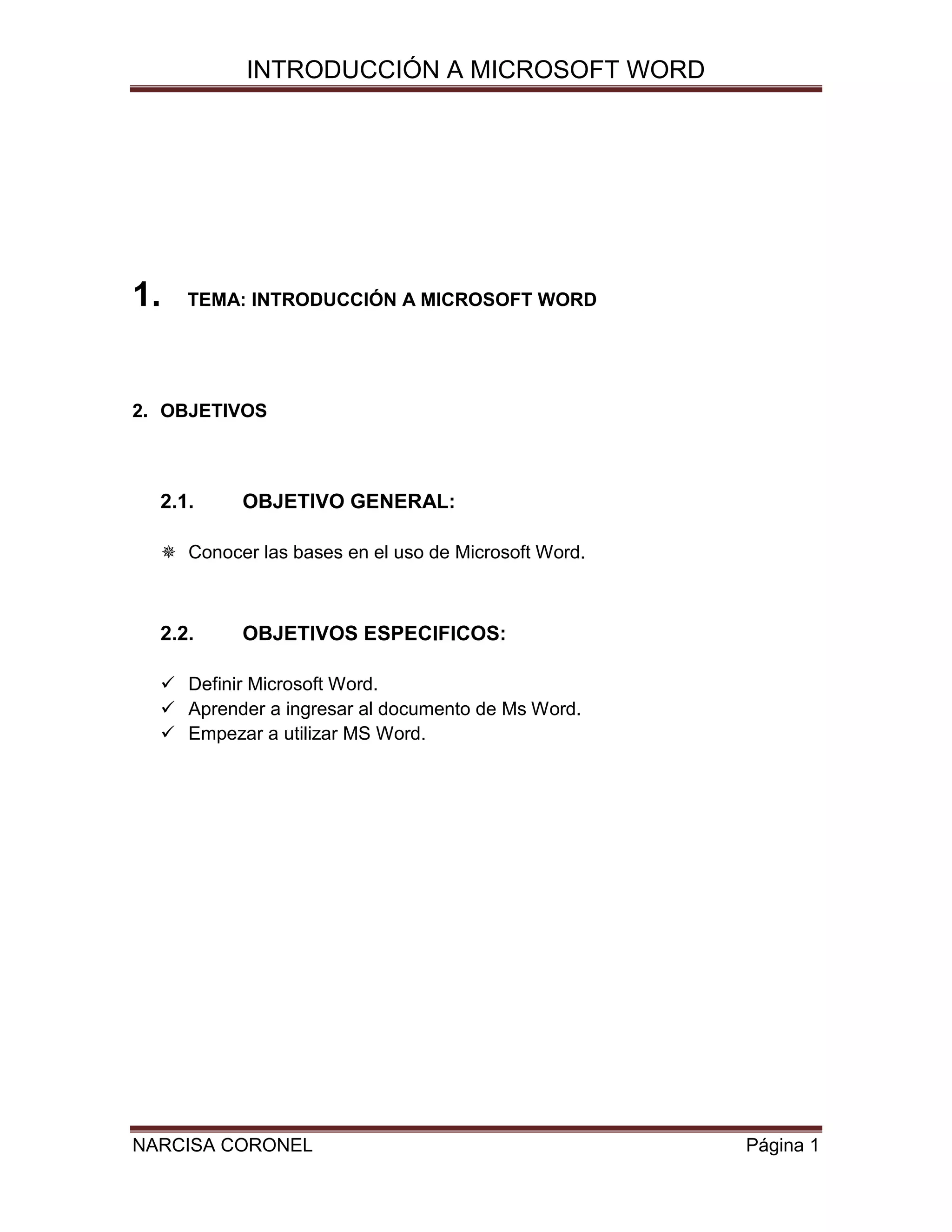 Este documento presenta una introducción a Microsoft Word. Explica que Word es una herramienta de Microsoft Office que permite crear, formatear y editar documentos. Detalla los tres objetivos principales de aprender sobre Word: definirlo, aprender a ingresar al programa y empezar a utilizarlo. Además, describe cómo ingresar a Word, escribir documentos y guardarlos.