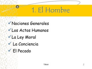 La teología moral estudia los actos humanos considerándolos en orden a su fin sobrenatural. Sus fuentes principales son la Sagrada Escritura, la Tradición y el Magisterio. Define falsas concepciones de la moral como la moral de actitudes, de situación, la nueva moral y la moral consecuencialista.