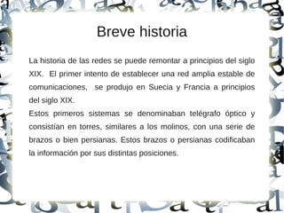 La historia de las redes de datos se remonta al siglo XIX con el telégrafo óptico y luego el telégrafo eléctrico. En la década de 1960, las primeras computadoras estaban conectadas a través de líneas telefónicas. En 1969 se estableció la primera conexión de ARPANET entre cuatro universidades, marcando el comienzo de Internet. En 1983, TCP/IP se estableció como el protocolo estándar, permitiendo la expansión de Internet.