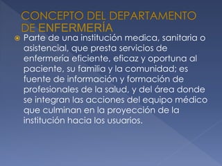 El documento describe las funciones de la enfermería como parte de una institución médica. Proporciona atención eficiente, eficaz y oportuna al paciente, su familia y la comunidad. La enfermería se ubica físicamente en los controles de enfermería, estaciones de enfermeras y oficinas administrativas. Además, sirve como fuente de información y formación de profesionales de la salud.