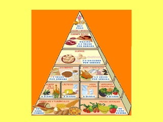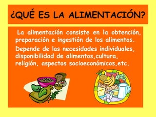 Este documento habla sobre nutrición y alimentación saludable. Explica conceptos como dieta equilibrada, importancia de una buena alimentación y la pirámide alimenticia, que indica la frecuencia recomendada de diferentes alimentos. También cubre beneficios del ejercicio físico y consecuencias de una mala nutrición como obesidad, anorexia, bulimia y otras enfermedades.