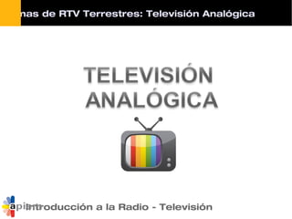Este documento describe los sistemas de televisión analógica y digital terrestre. Explica los estándares de televisión analógica NTSC y PAL, así como los procesos de codificación, modulación y transmisión de señales de televisión. También describe los sistemas de televisión digital, incluyendo la conversión de señales analógicas a digitales, la codificación MPEG, la multiplexación y modulación COFDM para la transmisión terrestre digital.