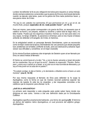 Este documento presenta una introducción a la apologética, definiéndola como la defensa y justificación racional de la religión católica ante los desafíos de la época. Explica que surgió en los primeros siglos para defender la fe ante las persecuciones romanas y el rechazo de los judíos, y que ha enfrentado varios períodos históricos de desafíos. Hoy en día es necesaria ante los ataques a la fe desde grupos cristianos fundamentalistas, religiones, ateísmo y errores dentro de la Igles