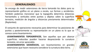 Este documento describe los conceptos fundamentales de la topografía, incluyendo su definición como la disciplina que mide extensiones de tierra y determina posiciones de puntos para su representación en planos. Explica los tipos de levantamientos topográficos y geodésicos, las etapas de un levantamiento, y los tipos de errores y cómo mitigarlos para lograr mediciones precisas. Además, enfatiza la importancia de aplicar procedimientos adecuados durante la medición y cálculo de dimensiones topográficas.